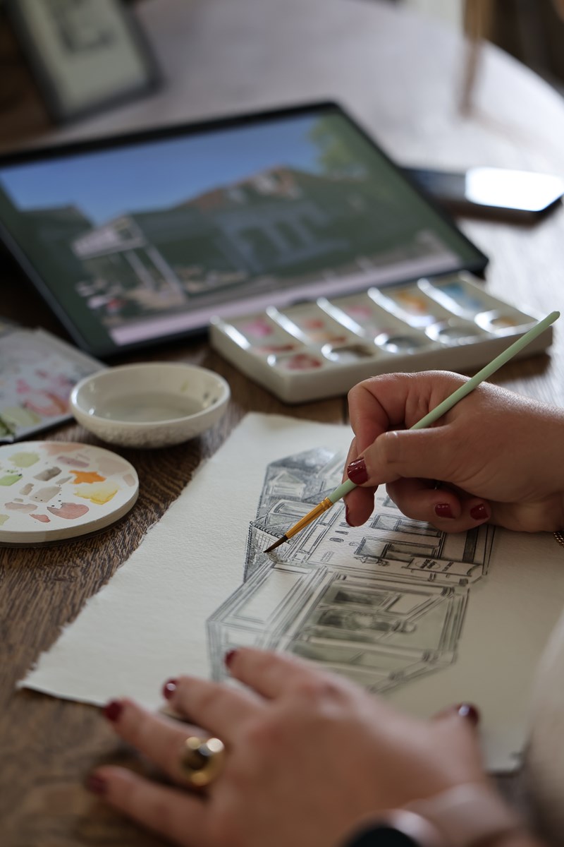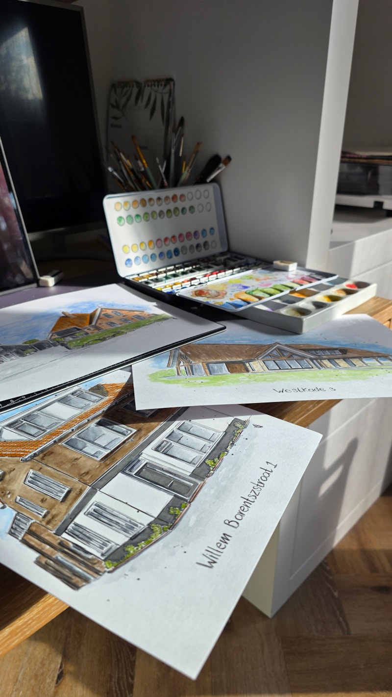 Soms start ik met illustreren op mijn tablet. Het huis teken ik vanuit een bepaalde hoek, zodat er meer zichtbaar is dan alleen de voorgevel. Als het huis in grote lijnen getekend is, print ik deze uit en ga ik op papier inkleuren met aquarel. Zie het eindresultaat. Houd jij de illustratie…