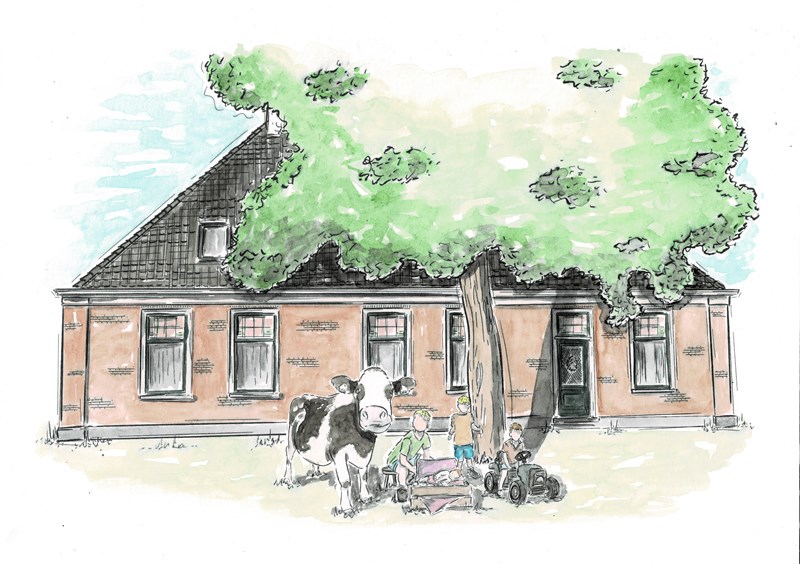 Deze boerderij tekende ik inclusief koe en kleinkinderen. Een huisdier of een persoon toevoegen aan een huisportret doe ik altijd aan de hand van foto’s. Deze illustreer ik altijd op mijn eigen abstracte manier. Alle extra’s bij een huisportret hebben een meerprijs.